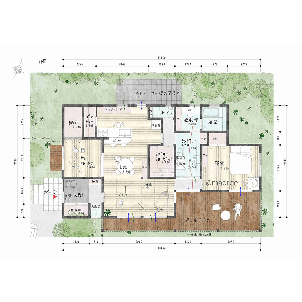 全国の建築家から間取りが集まるmadree(マドリー)で集まった28坪、1LDKの間取りです。外とつながるLDKやアウトドアリビングが特徴の注文住宅の間取りです。