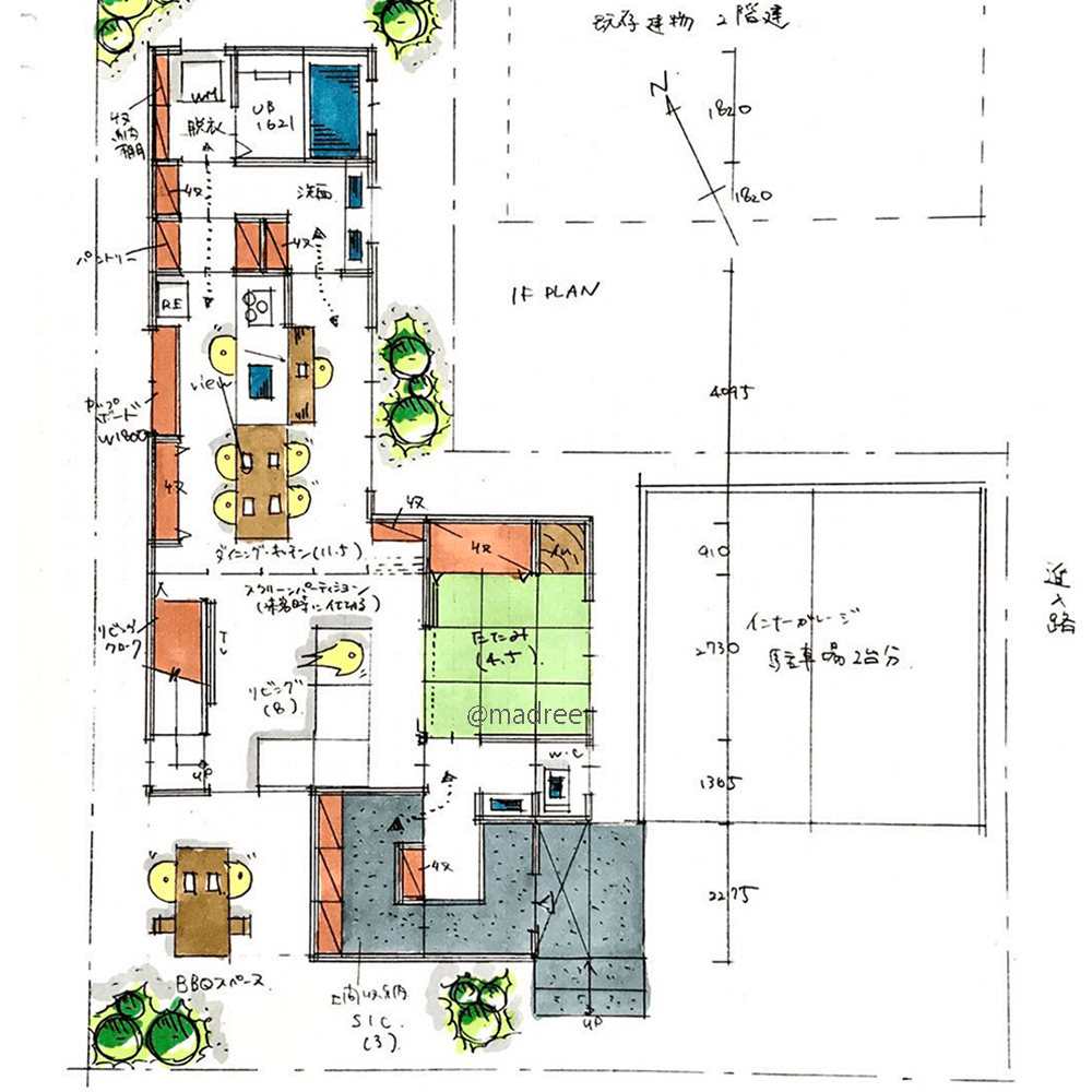 全国の建築家から間取りが集まるmadree(マドリー)で集まった40坪、3LDKの間取りです。アウトドアリビングやリビング一体の畳が特徴の注文住宅の間取りです。