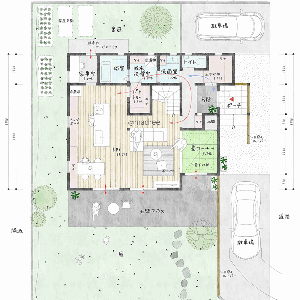 全国の建築家から間取りが集まるmadree(マドリー)で集まった36坪、3LDKの間取りです。外とつながるLDKやアウトドアリビングが特徴の注文住宅の間取りです。