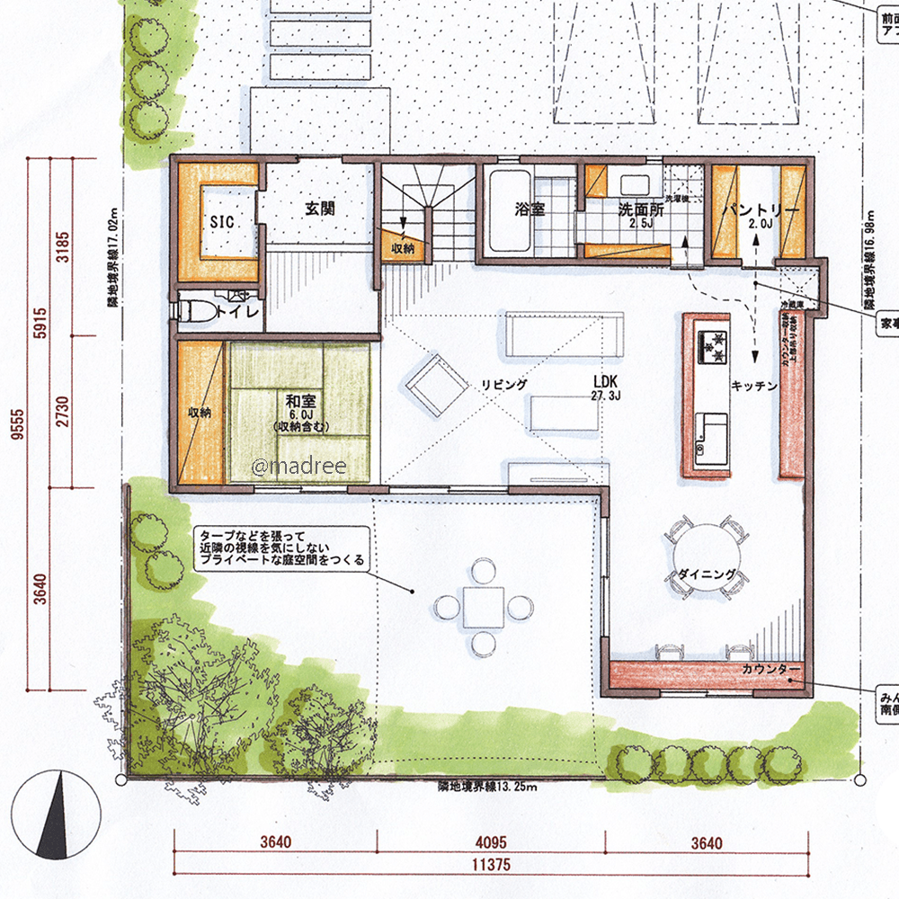 全国の建築家から間取りが集まるmadree(マドリー)で集まった41坪、4LDKの間取りです。外とつながるLDKやリビング中心の動線が特徴の注文住宅の間取りです。