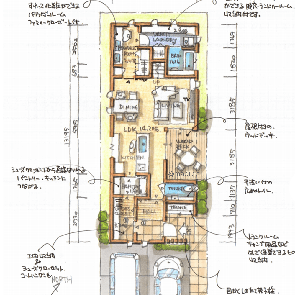 全国の建築家から間取りが集まるmadree(マドリー)で集まった27坪〜30坪、2LDKの間取りです。外とつながるLDKやアウトドアリビングが特徴の注文住宅の間取りです。
