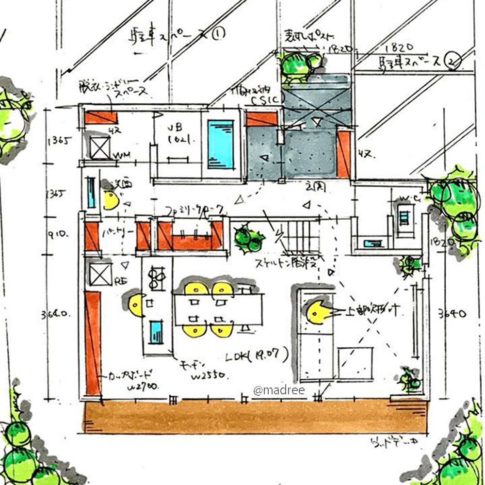 全国の建築家から間取りが集まるmadree(マドリー)で集まった48坪、4LDKの間取りです。外とつながるLDKやリビング吹抜が特徴の注文住宅の間取りです。