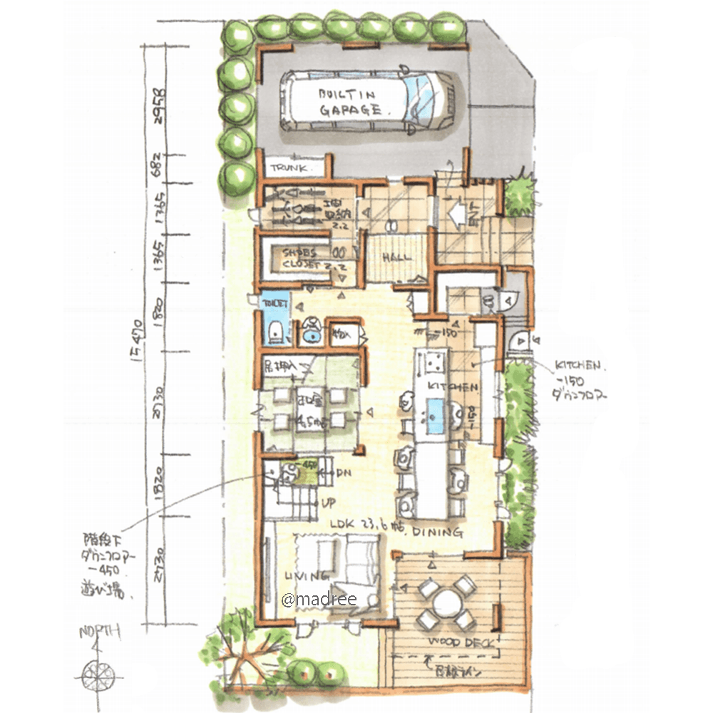 全国の建築家から間取りが集まるmadree(マドリー)で集まった43坪、3LDKの間取りです。外とつながるLDKやアウトドアリビングが特徴の注文住宅の間取りです。