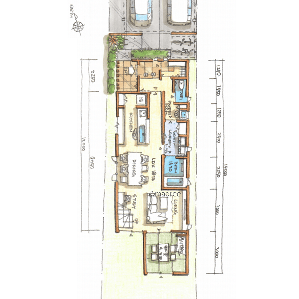 全国の建築家から間取りが集まるmadree(マドリー)で集まった34坪、4LDKの間取りです。リビング吹抜やリビング一体の畳が特徴の注文住宅の間取りです。