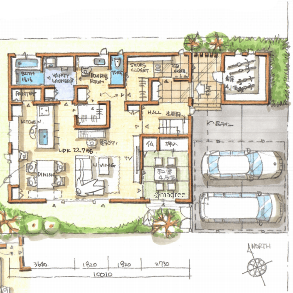 全国の建築家から間取りが集まるmadree(マドリー)で集まった45坪、4LDKの間取りです。広く感じるLDKや仏間が特徴の注文住宅の間取りです。