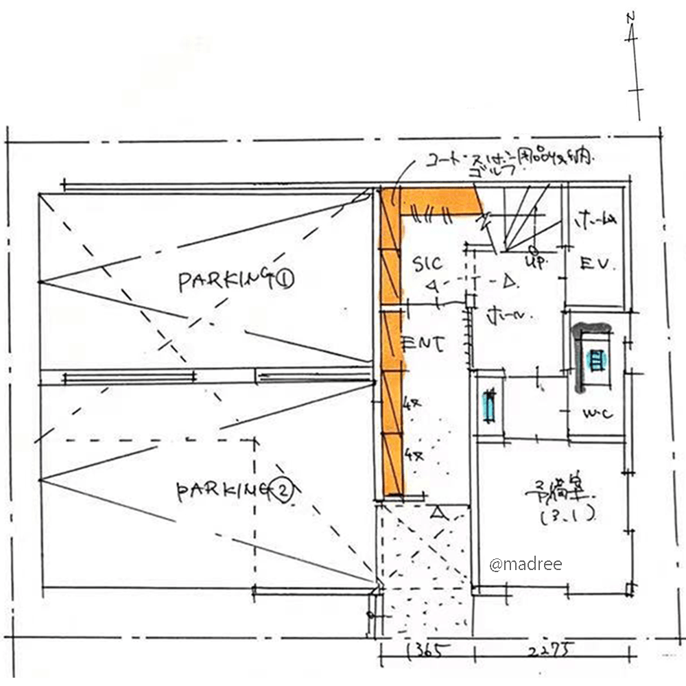 ・正面に2台の駐車場を確保しました。1台はビルトイン、もう1台は一部屋根が掛かる配置です。