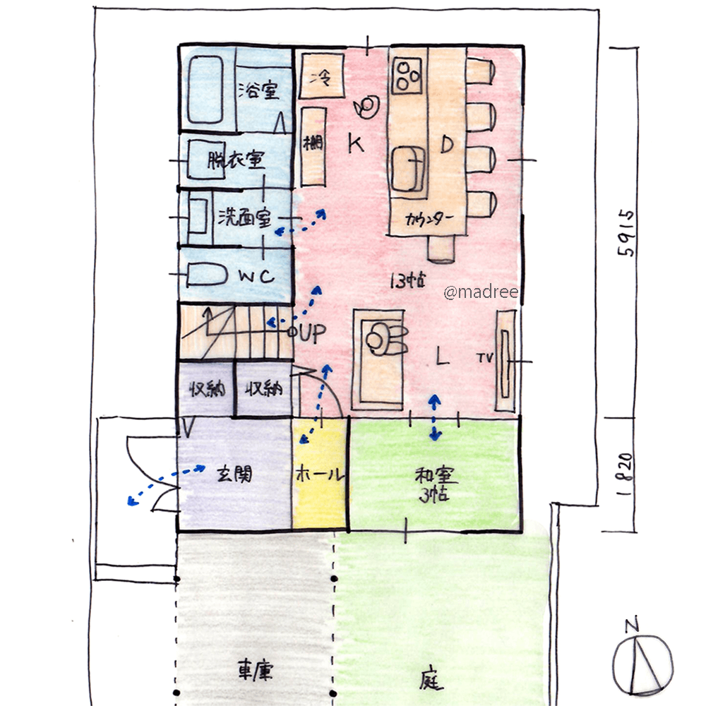 [26坪 5LDK] キッチンから庭まで視線が抜ける、家族と多く触れ合うリビング中心の家の間取り