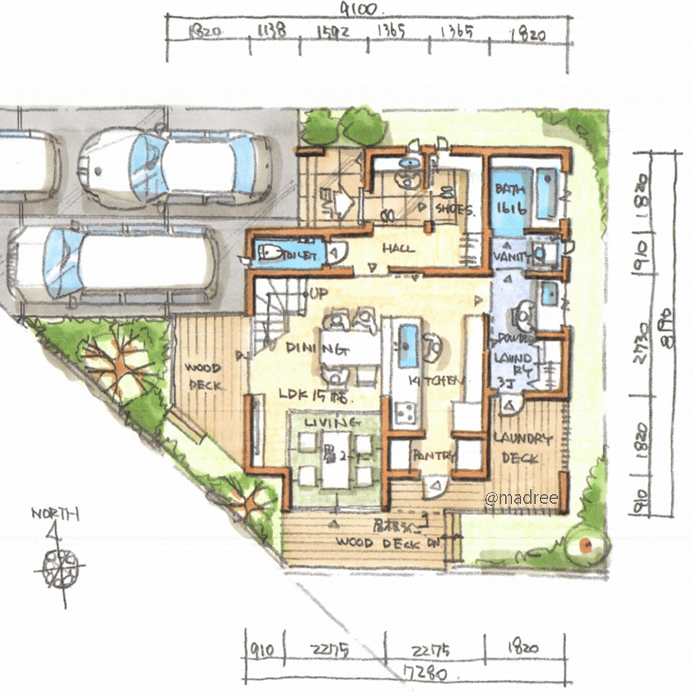 全国の建築家から間取りが集まるmadree(マドリー)で集まった27坪〜30坪、4LDKの間取りです。外とつながるLDKやアウトドアリビングが特徴の注文住宅の間取りです。