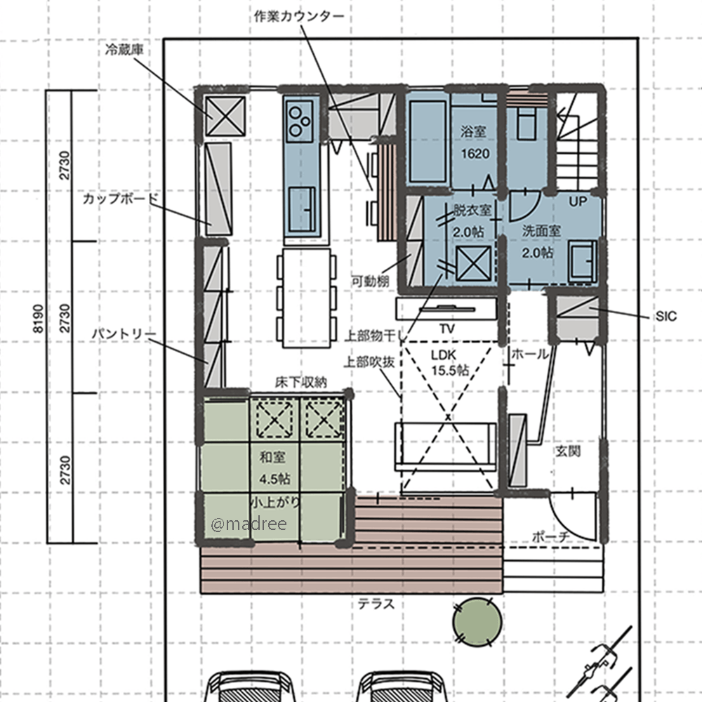 全国の建築家から間取りが集まるmadree(マドリー)で集まった33坪、3LDKの間取りです。外とつながるLDKやリビング吹抜が特徴の注文住宅の間取りです。