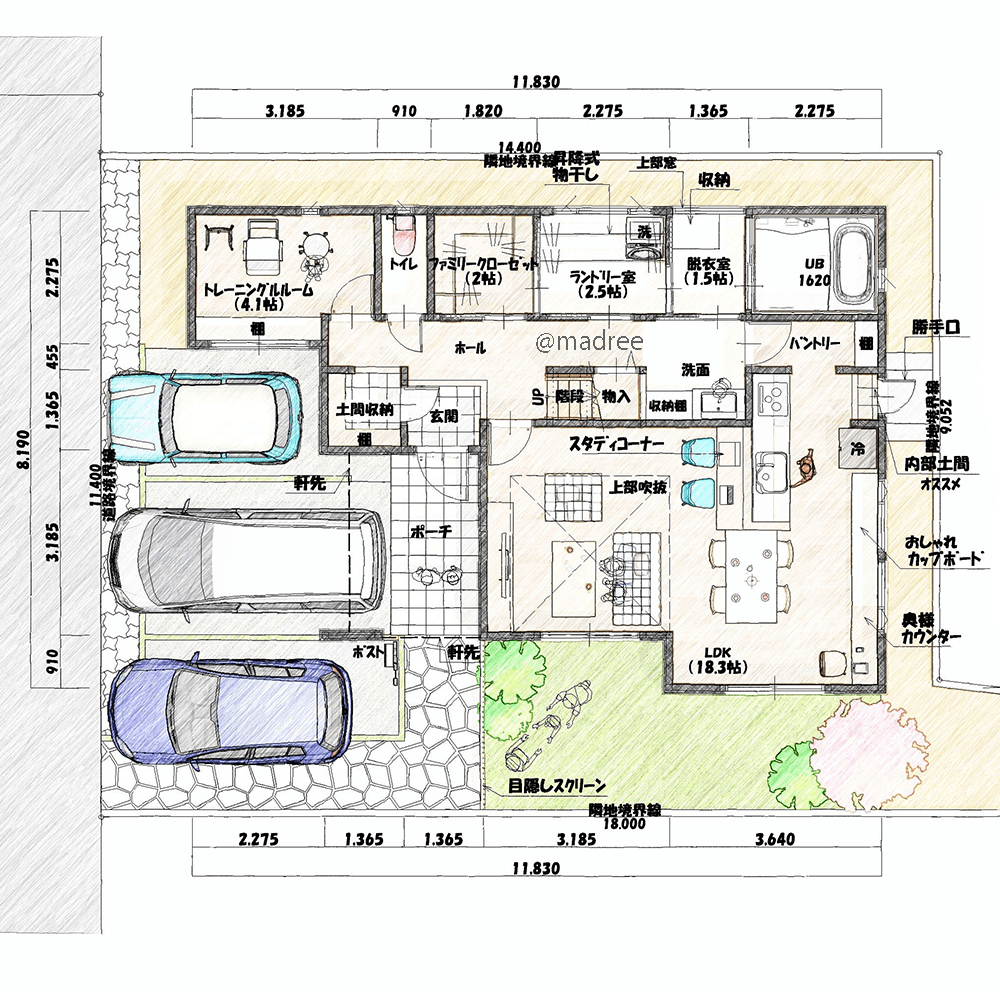 ・トレーニングルームの位置は、集中できるようにLDKから離し、独立した配置としました。