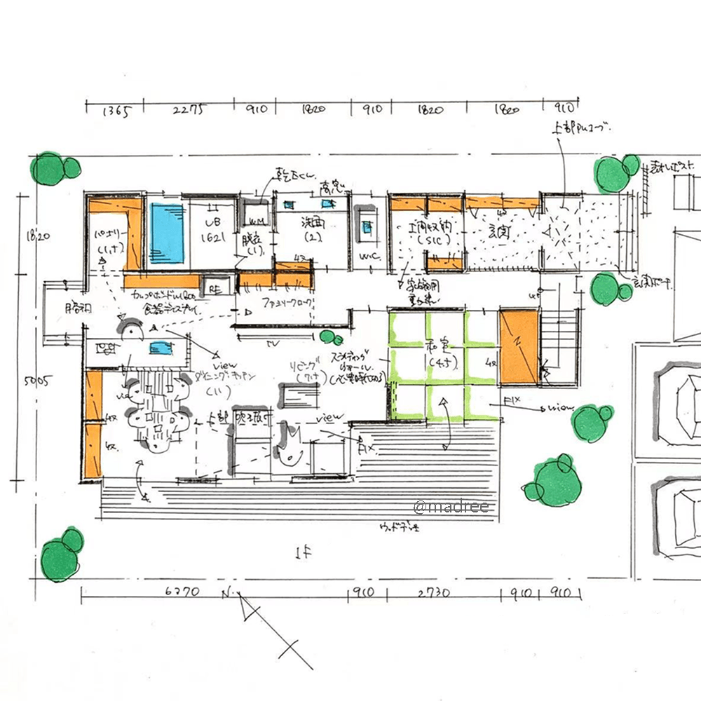 全国の建築家から間取りが集まるmadree(マドリー)で集まった41坪、5LDKの間取りです。外とつながるLDKやアウトドアリビングが特徴の注文住宅の間取りです。