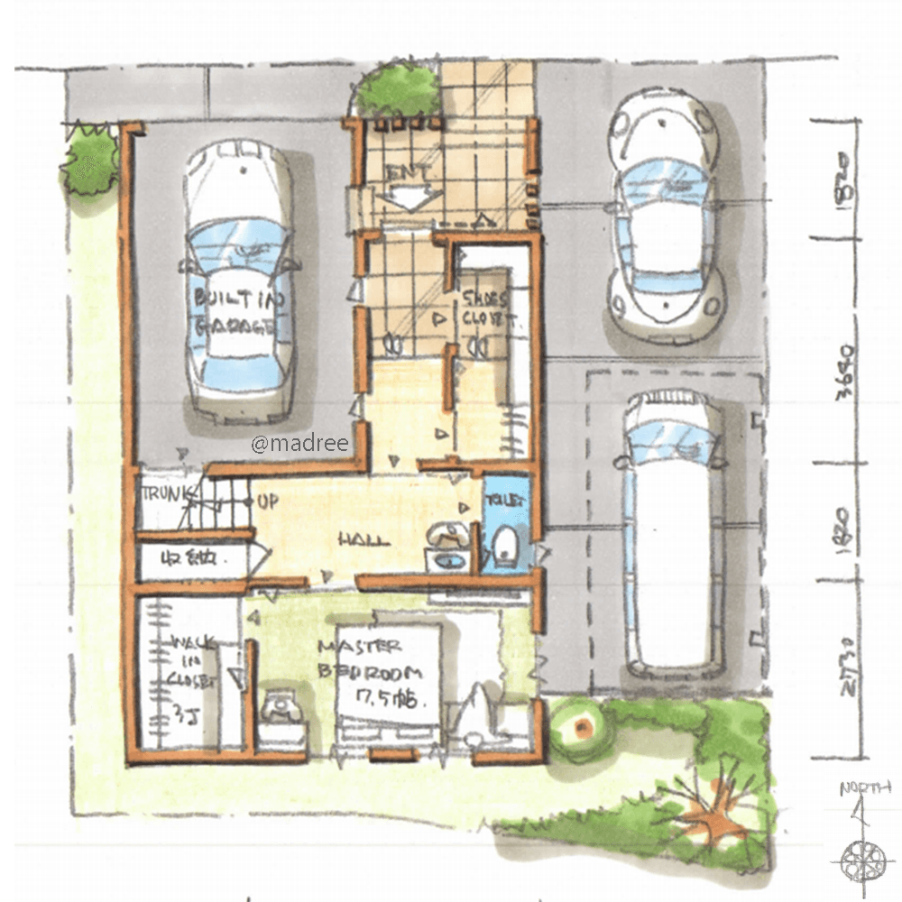 全国の建築家から間取りが集まるmadree(マドリー)で集まった27坪〜30坪、2LDKの間取りです。外とつながるLDKやアウトドアリビングが特徴の注文住宅の間取りです。