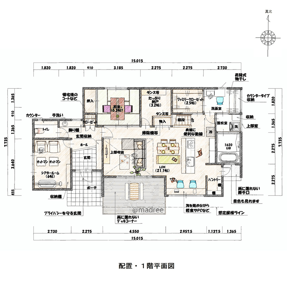 全国の建築家から間取りが集まるmadree(マドリー)で集まった39坪、4LDKの間取りです。外とつながるLDKやアウトドアリビングが特徴の注文住宅の間取りです。