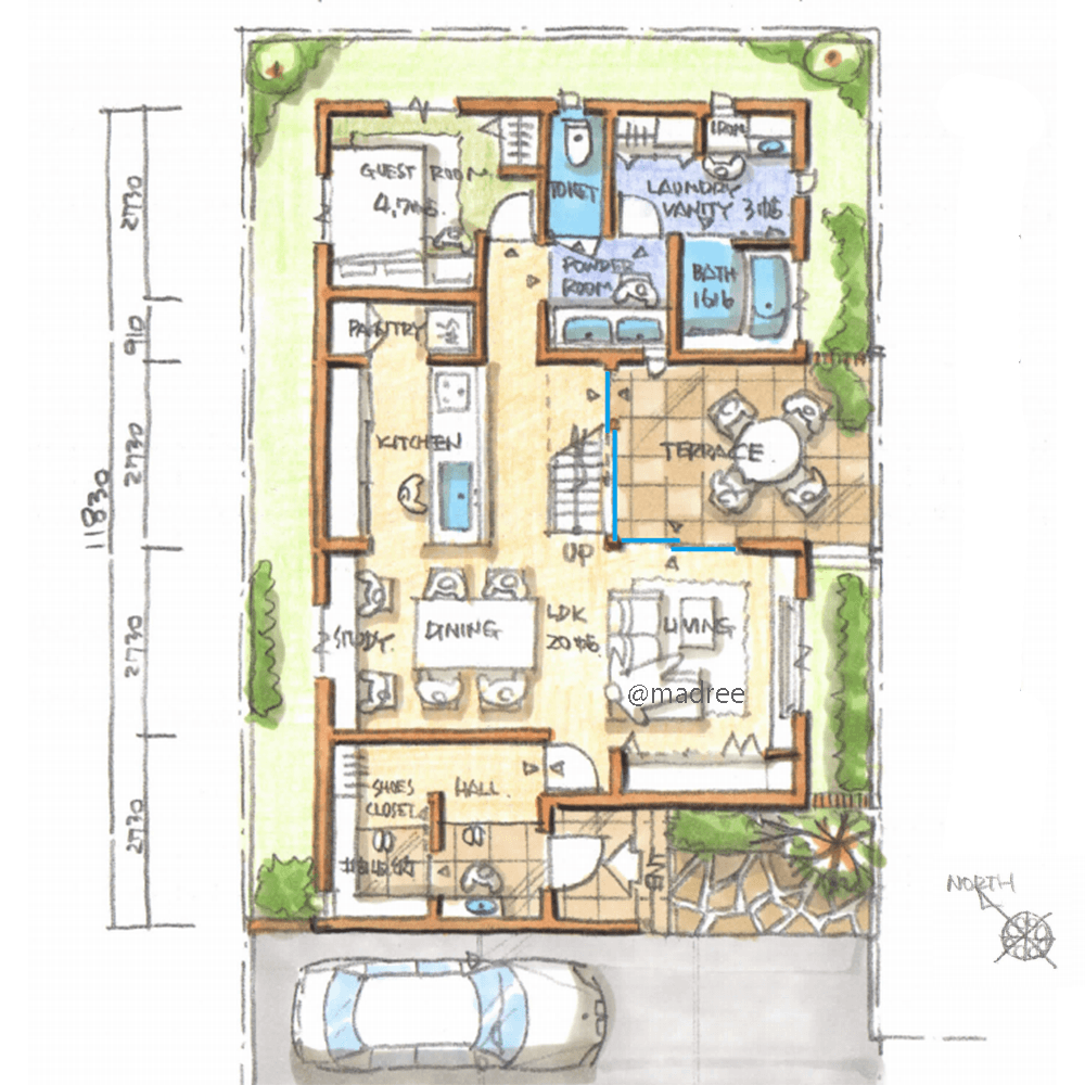 全国の建築家から間取りが集まるmadree(マドリー)で集まった37坪、5LDKの間取りです。外とつながるLDKやアウトドアリビングが特徴の注文住宅の間取りです。