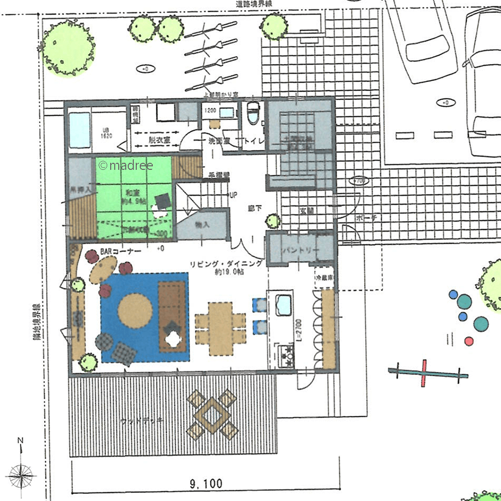全国の建築家から間取りが集まるmadree(マドリー)で集まった41坪、3LDKの間取りです。外とつながるLDKやアウトドアリビングが特徴の注文住宅の間取りです。