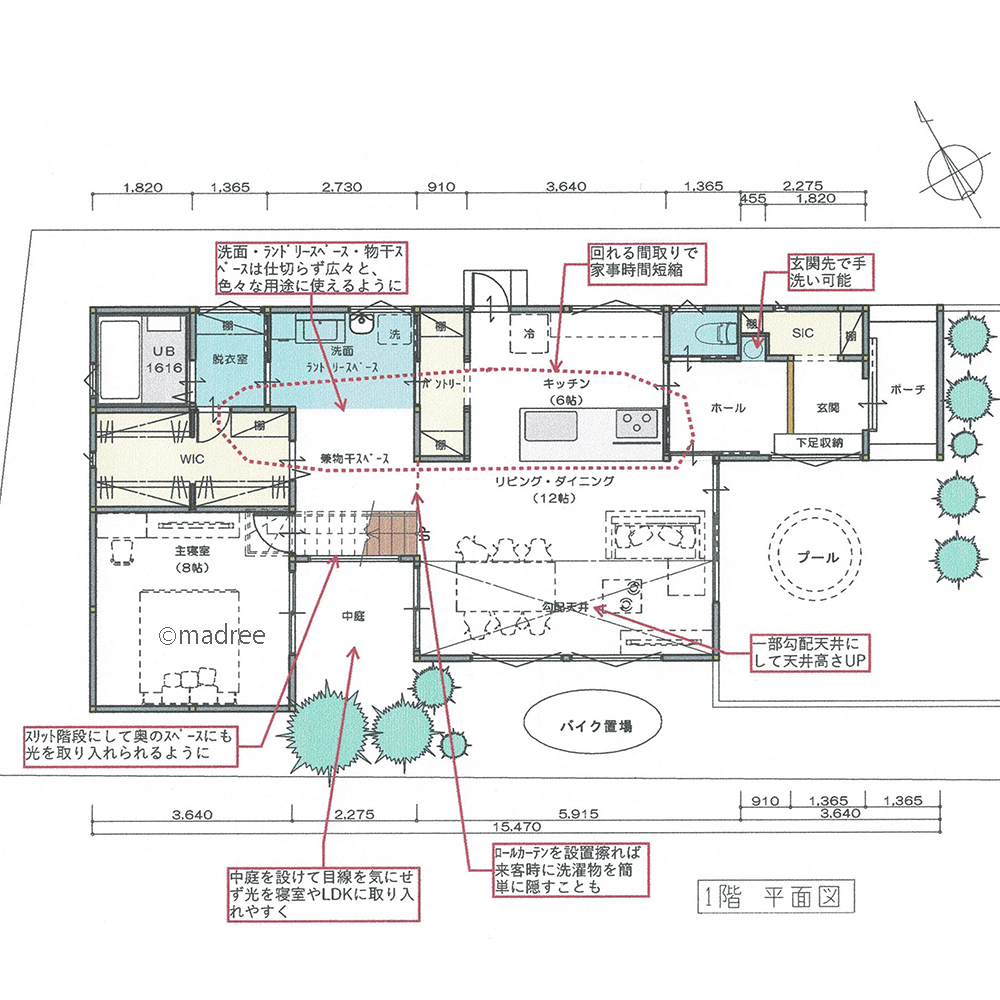 全国の建築家から間取りが集まるmadree(マドリー)で集まった38坪、3LDKの間取りです。広く感じるLDKやプライバシー守るが特徴の注文住宅の間取りです。