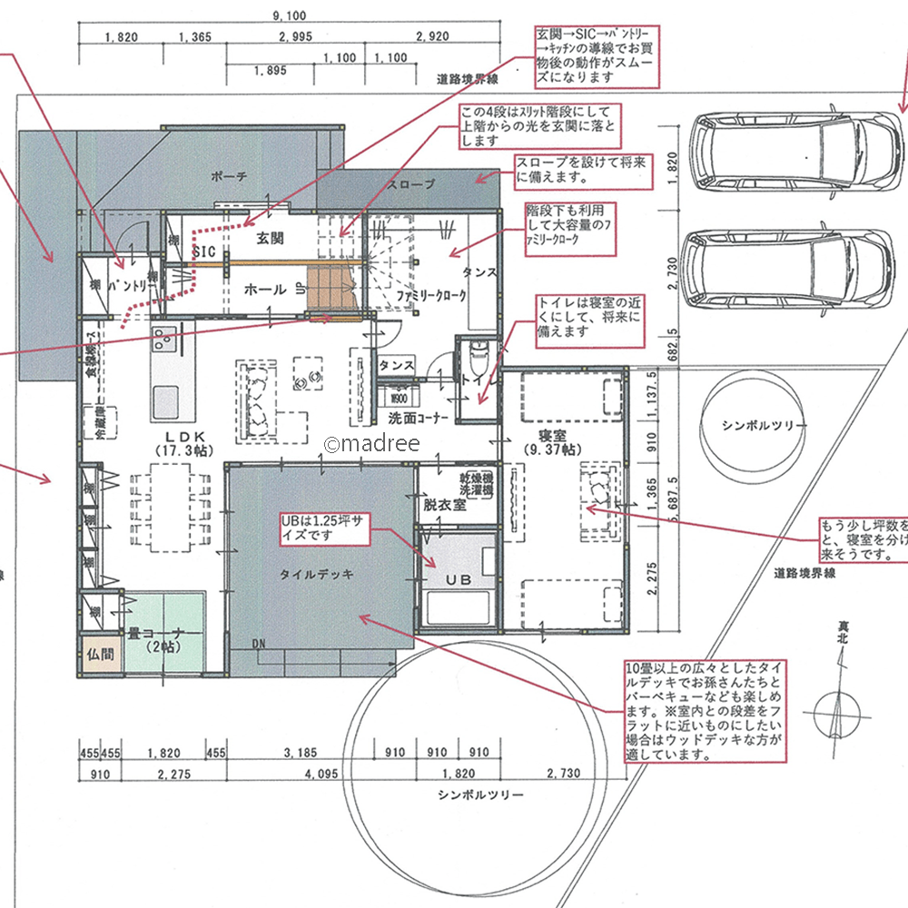 将来に備えた工夫とタイルデッキを中心とした間取りにしました。