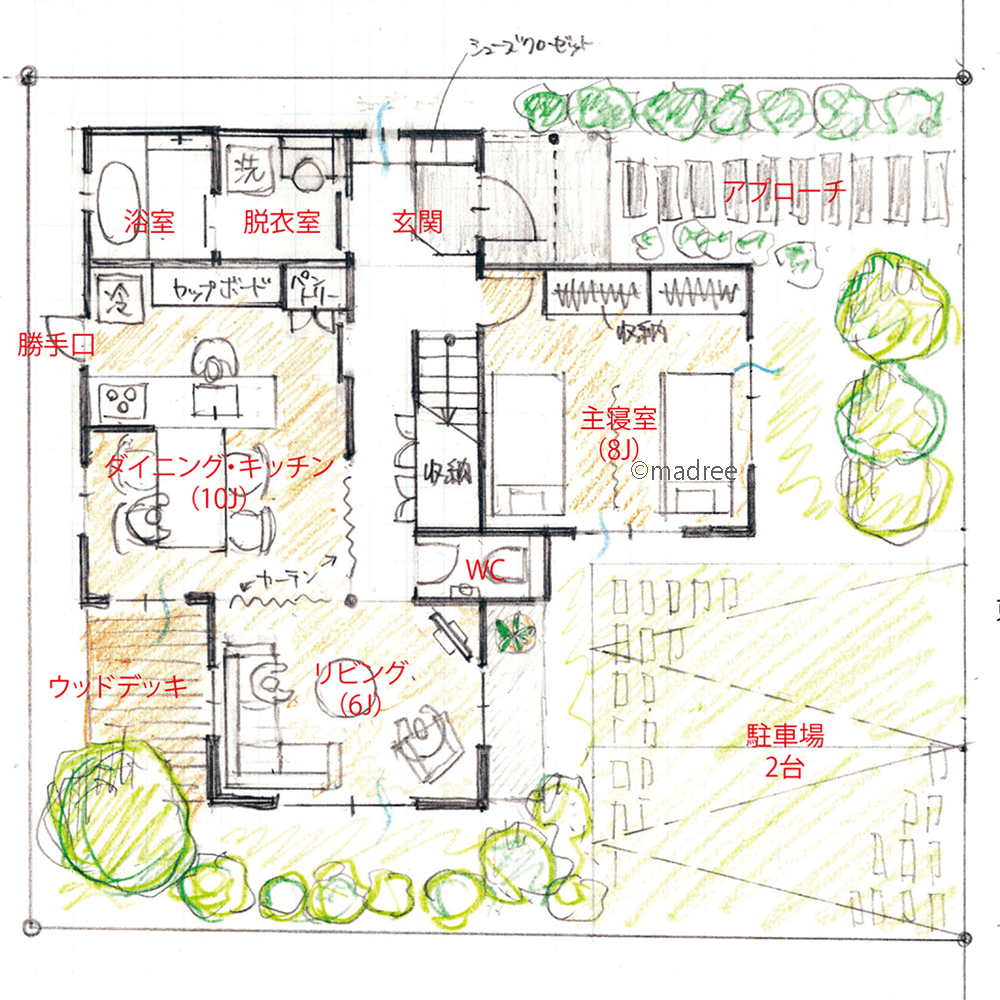 全国の建築家から間取りが集まるmadree(マドリー)で集まった27坪〜30坪、3LDKの間取りです。外とつながるLDKやアウトドアリビングが特徴の注文住宅の間取りです。