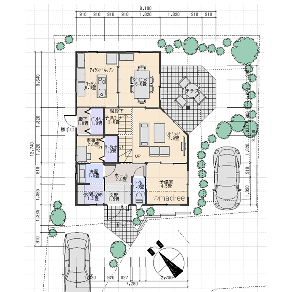 全国の建築家から間取りが集まるmadree(マドリー)で集まった40坪、4LDKの間取りです。外とつながるLDKやアウトドアリビングが特徴の注文住宅の間取りです。