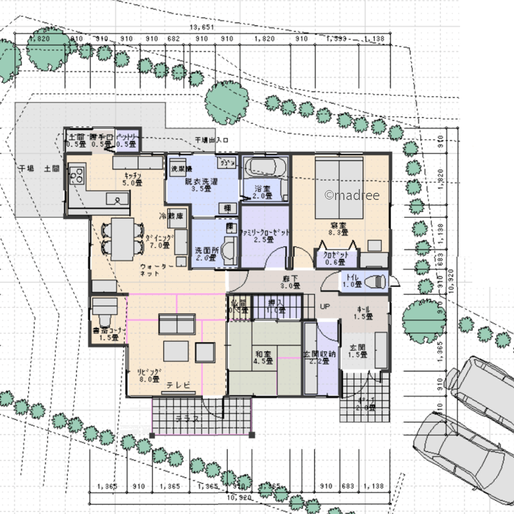 ・キッチンからの動線が最短となるような間取りとした。(キッチン→ダイニング→リビング→和室/キッチン→脱衣・洗濯→浴室)また、キッチンに隣接して土間とパントリーと勝手口を配置した。