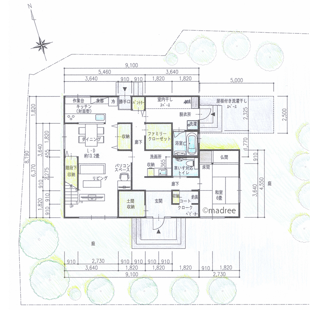 全国の建築家から間取りが集まるmadree(マドリー)で集まった40坪、4LDKの間取りです。外とつながるLDKやアウトドアリビングが特徴の注文住宅の間取りです。