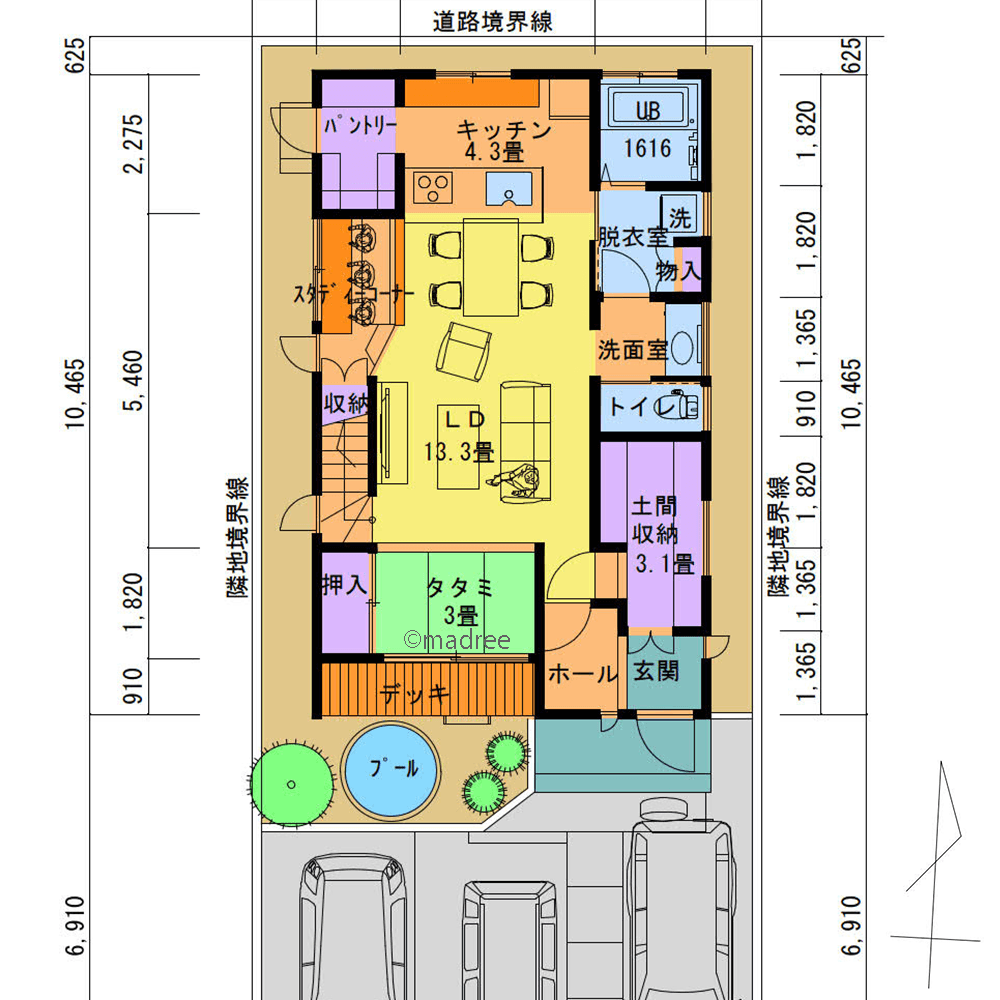 全国の建築家から間取りが集まるmadree(マドリー)で集まった34坪、2LDKの間取りです。広く感じるLDKやリビング一体の畳が特徴の注文住宅の間取りです。