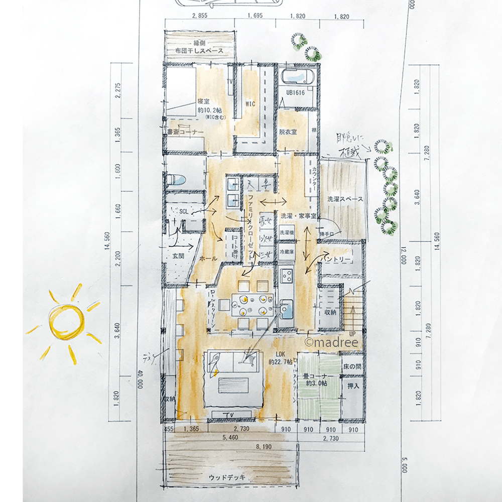 全国の建築家から間取りが集まるmadree(マドリー)で集まった43坪、3LDKの間取りです。外とつながるLDKやアウトドアリビングが特徴の注文住宅の間取りです。