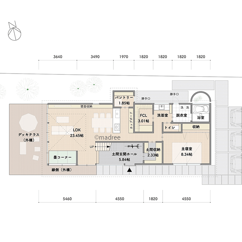 ・デッキテラスや土間玄関ホールなど、屋内外を繋げる場所を設けました。