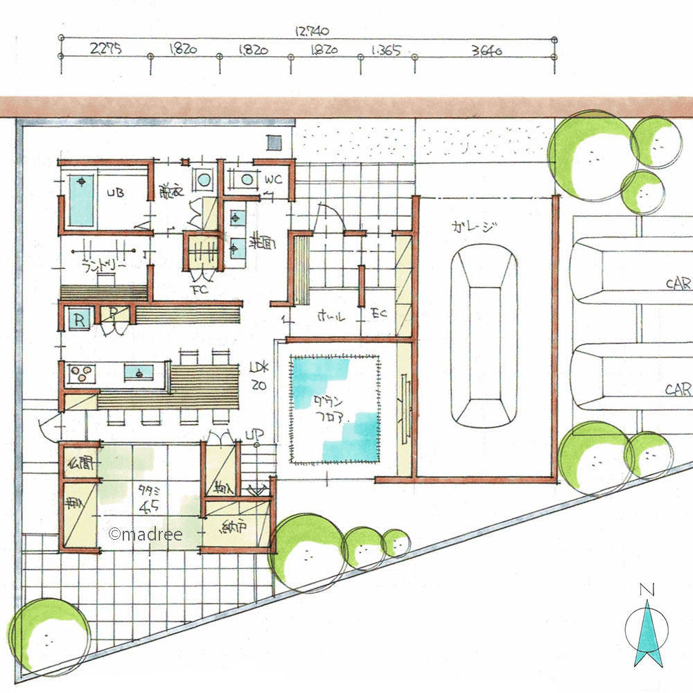 ・北側に水廻りを集約し、LDK・畳・階段は南側に配置しました。