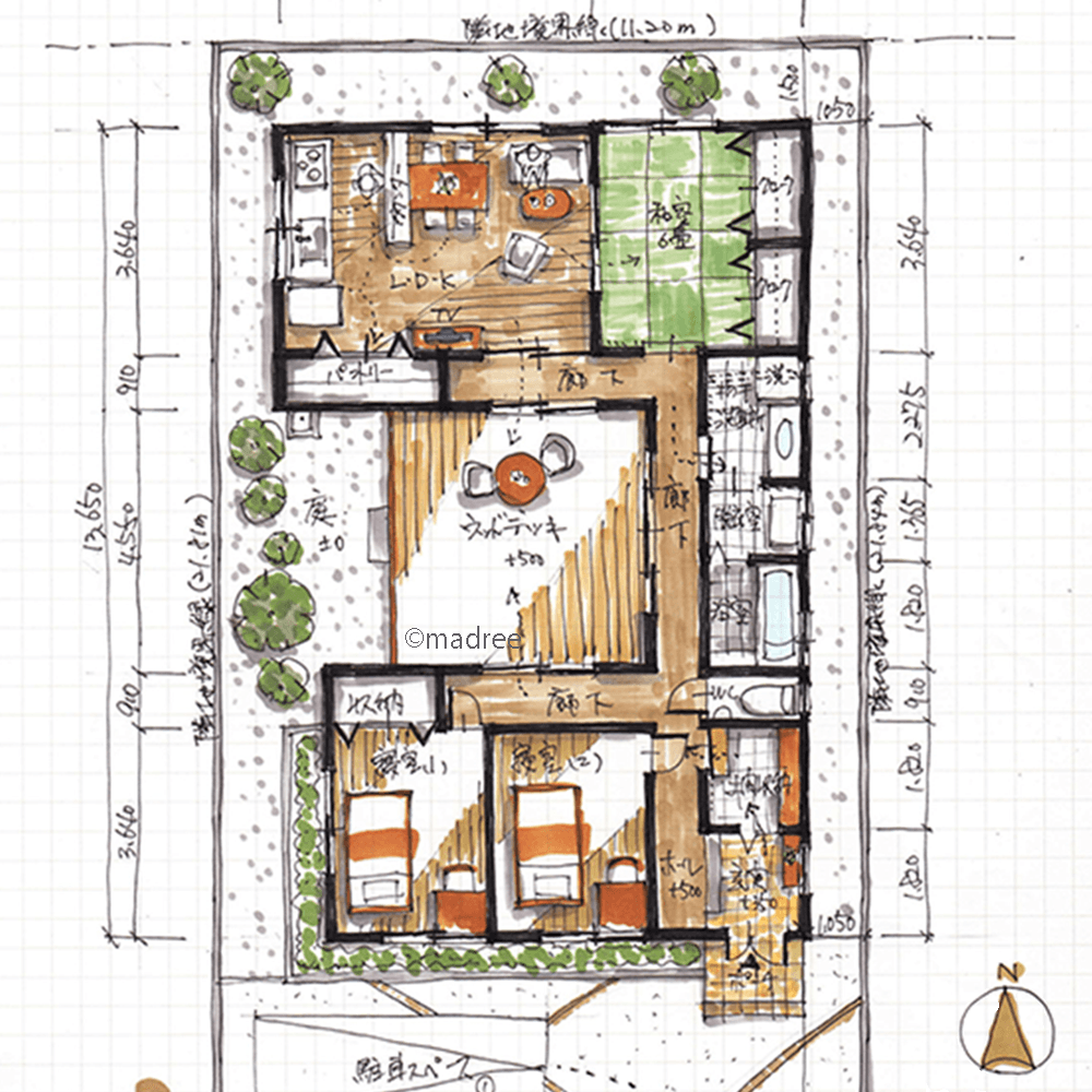・建物をコの字で囲んで、安心して過ごせるウッドデッキを設けたい。