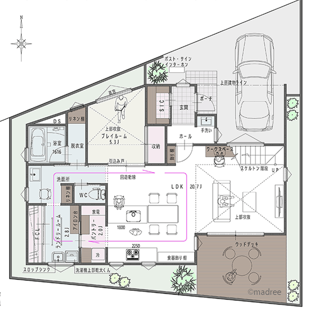 全国の建築家から間取りが集まるmadree(マドリー)で集まった41坪、2LDKの間取りです。外とつながるLDKやアウトドアリビングが特徴の注文住宅の間取りです。