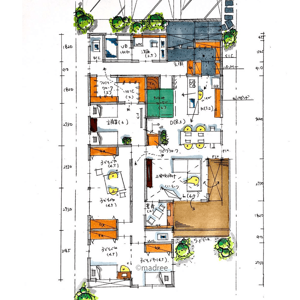 全国の建築家から間取りが集まるmadree(マドリー)で集まった36坪、4LDKの間取りです。外とつながるLDKやアウトドアリビングが特徴の注文住宅の間取りです。