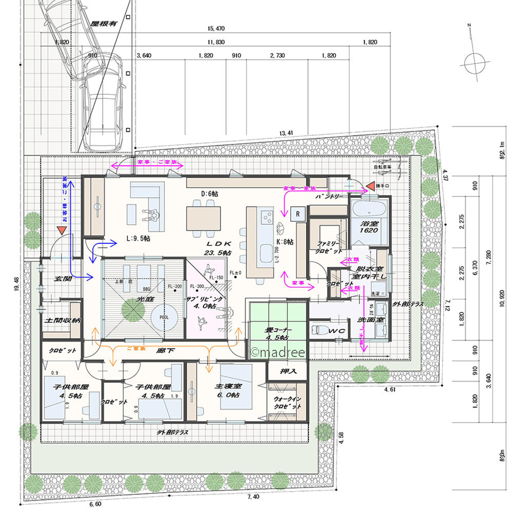 ・LDK:リビングは玄関に近い位置で、来客動線を短くしています。中庭(光庭) に面して、子ども用のサブリビングを設置し、キッチンからも目の届く位置としています。