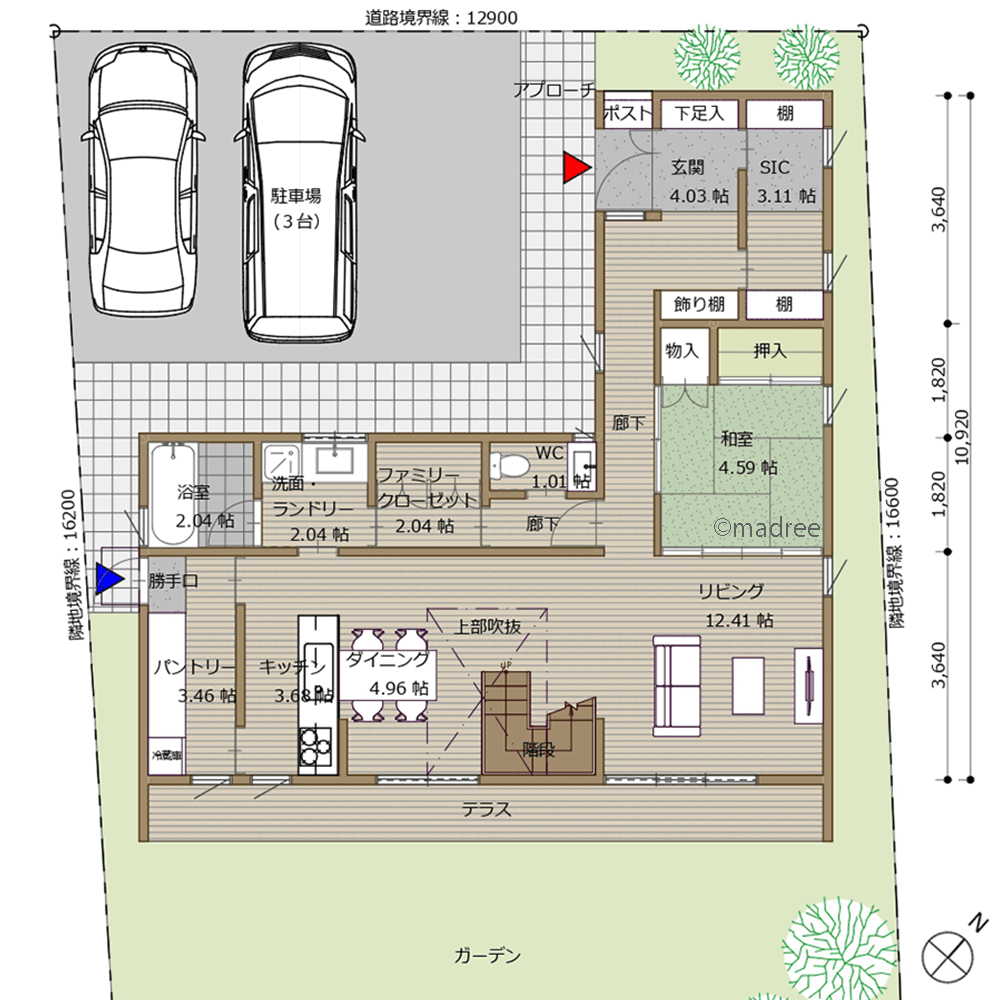 全国の建築家から間取りが集まるmadree(マドリー)で集まった41坪、4LDKの間取りです。外とつながるLDKやアウトドアリビングが特徴の注文住宅の間取りです。