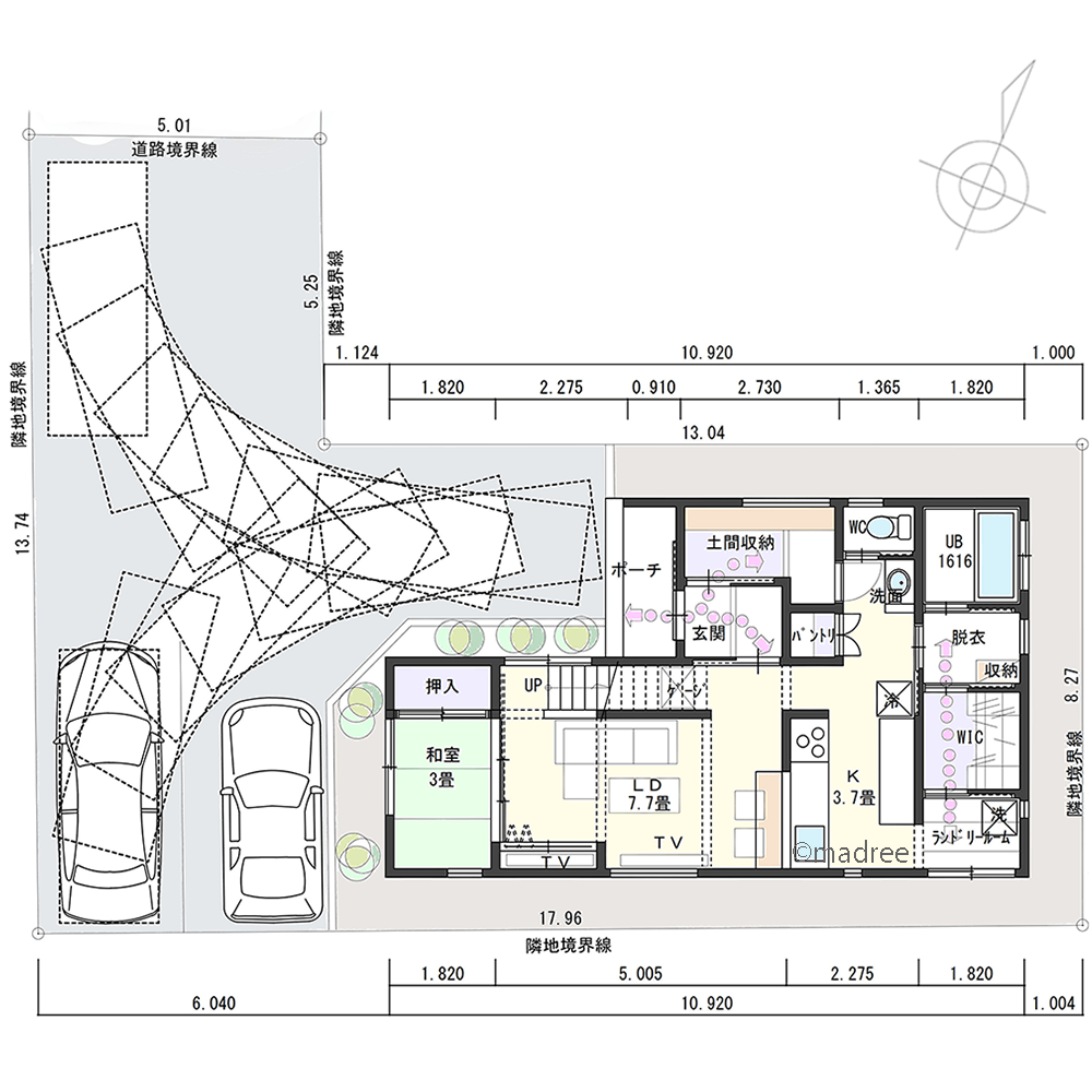[26坪 3LDK] 旗竿地を生かして回転駐車、アプローチが屋外プライベート場になる家の間取り