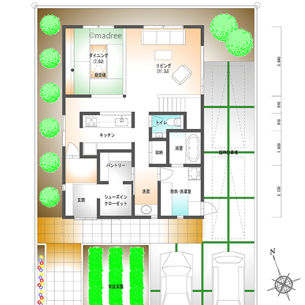 ・南の一番日当たりが良い位置に家庭菜園のスペースを設けました。