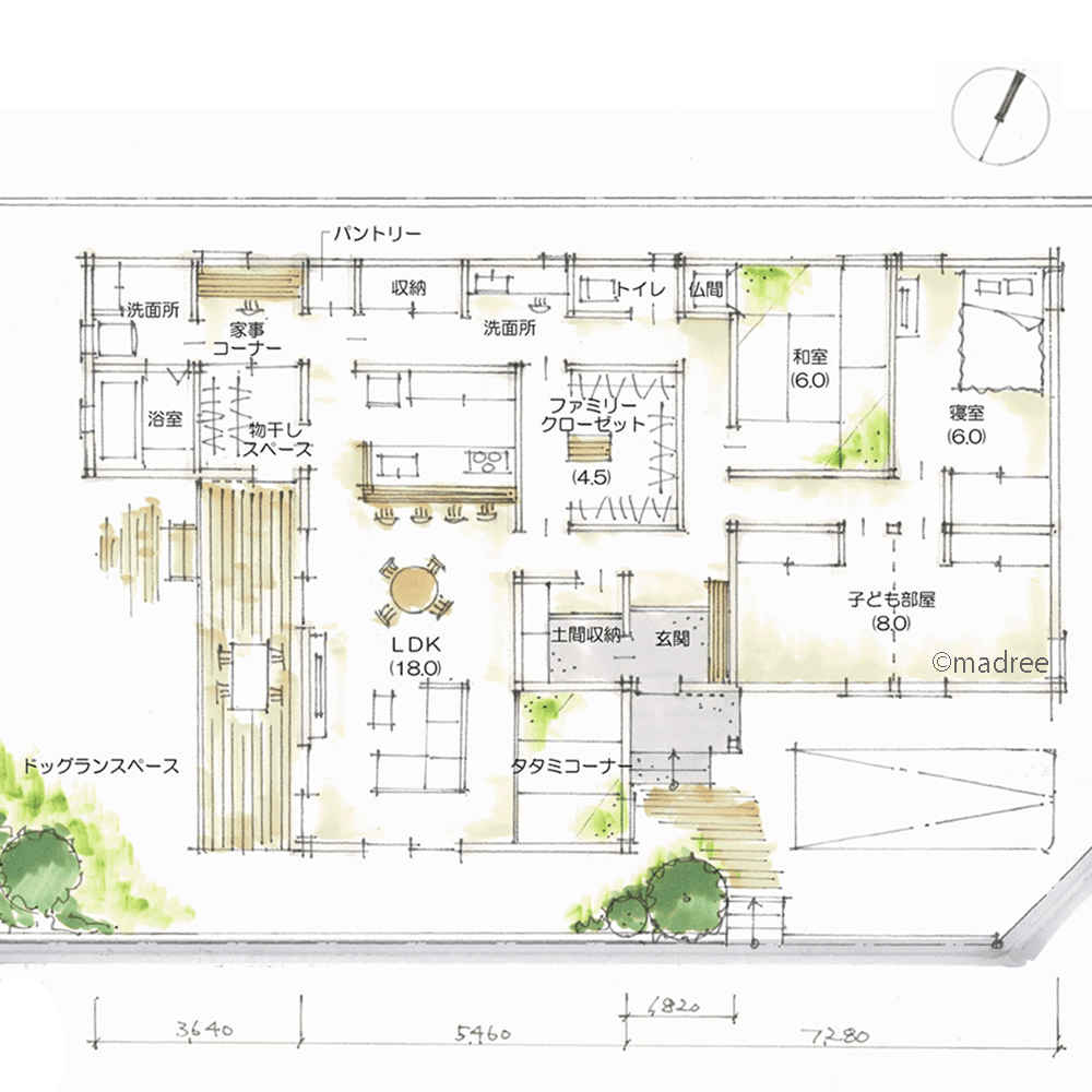 全国の建築家から間取りが集まるmadree(マドリー)で集まった37坪、3LDKの間取りです。外とつながるLDKやアウトドアリビングが特徴の注文住宅の間取りです。
