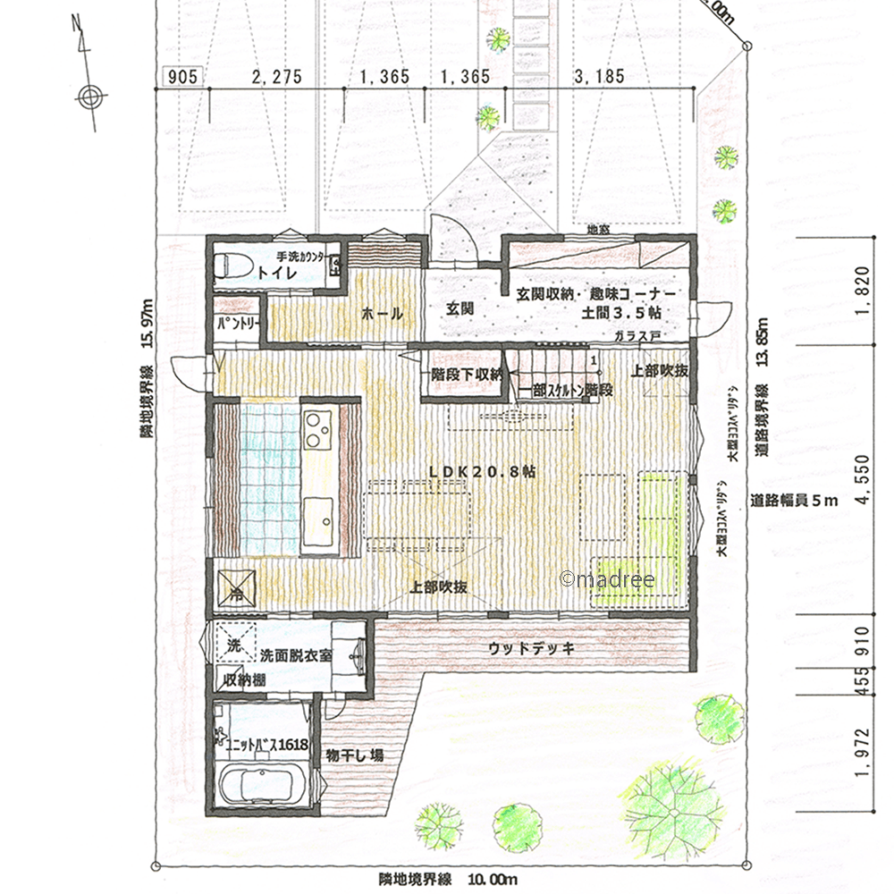 全国の建築家から間取りが集まるmadree(マドリー)で集まった32坪、3LDKの間取りです。外とつながるLDKやアウトドアリビングが特徴の注文住宅の間取りです。