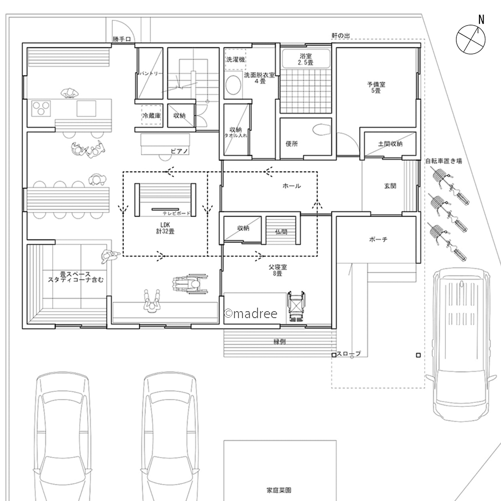 ・玄関周りに父寝室・水廻り・予備室をまとめ、訪問介護などに対応しやすくしました。