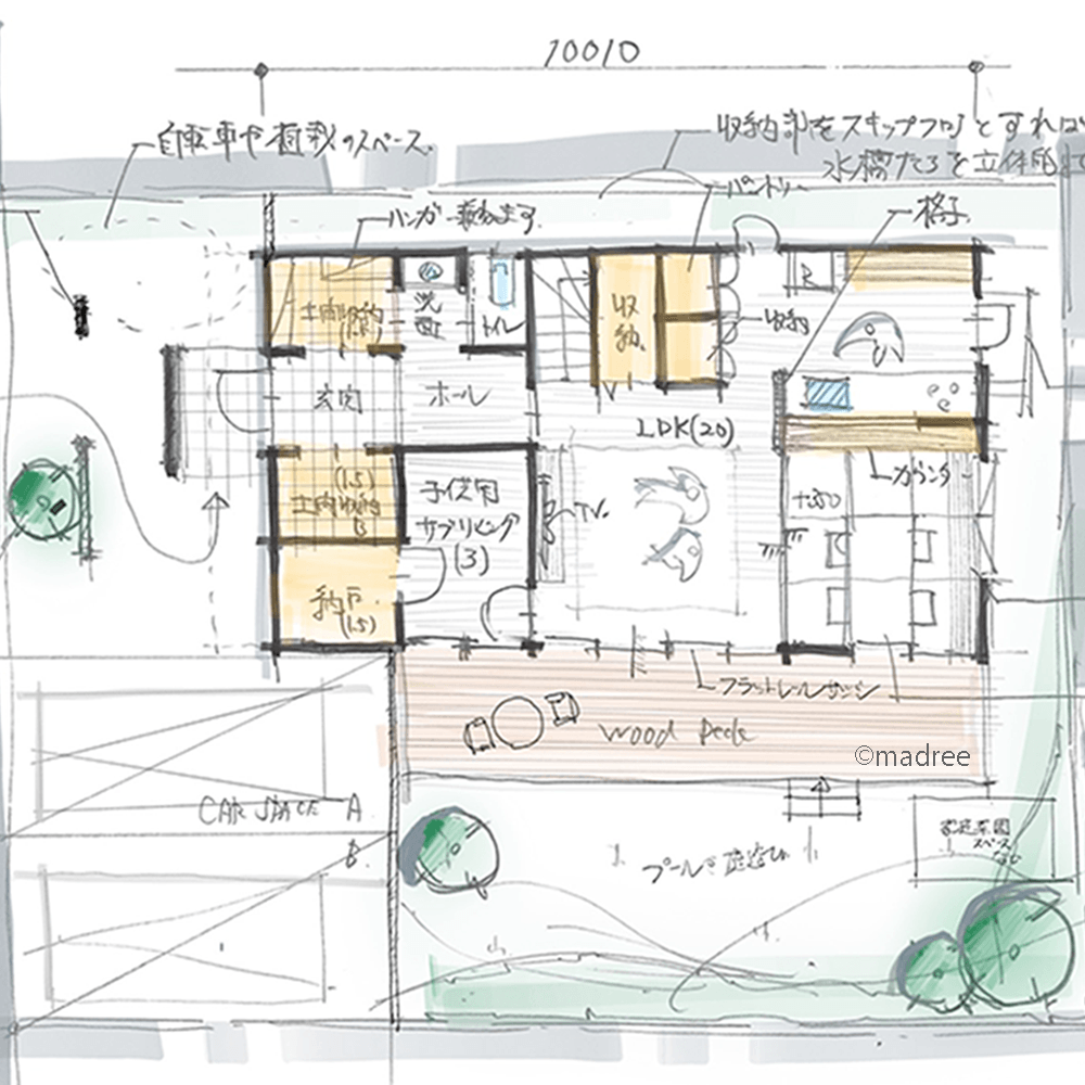 全国の建築家から間取りが集まるmadree(マドリー)で集まった34坪、4LDKの間取りです。外とつながるLDKやアウトドアリビングが特徴の注文住宅の間取りです。