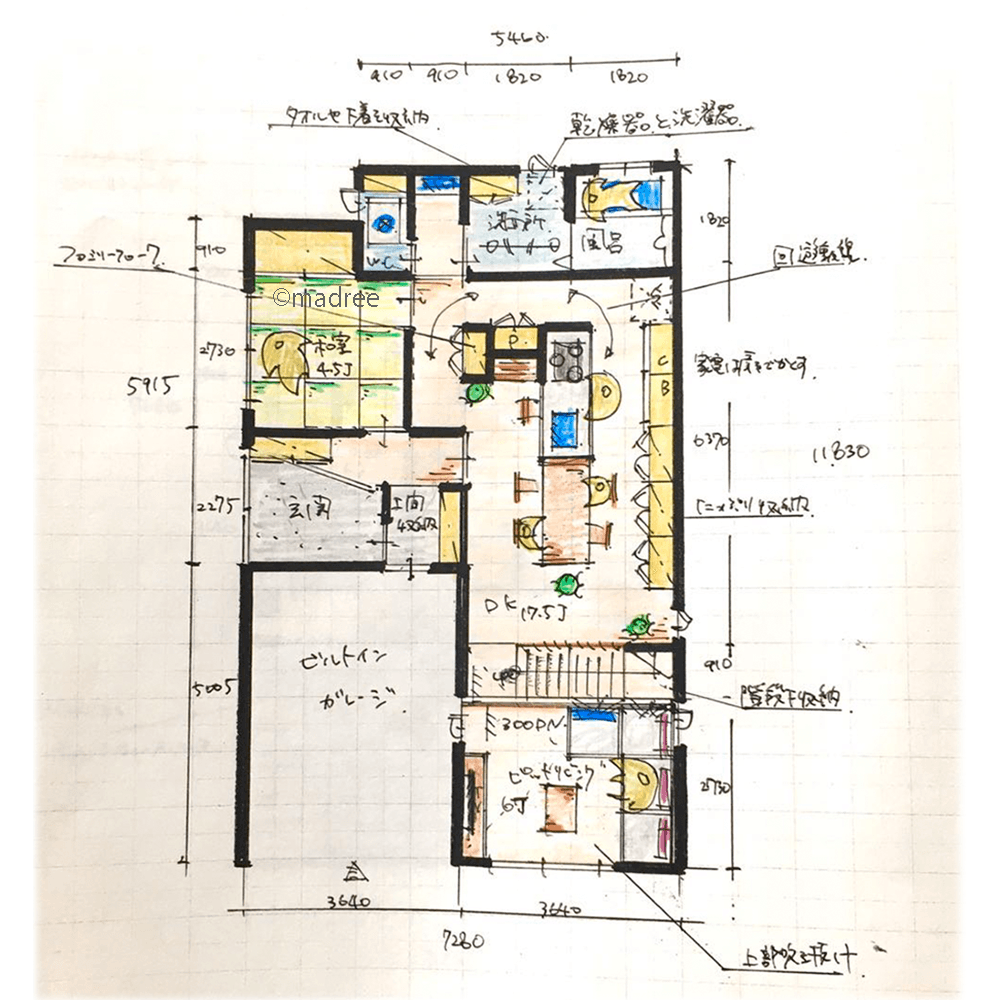 全国の建築家から間取りが集まるmadree(マドリー)で集まった38坪、4LDKの間取りです。リビング吹抜や南向きバルコニーが特徴の注文住宅の間取りです。