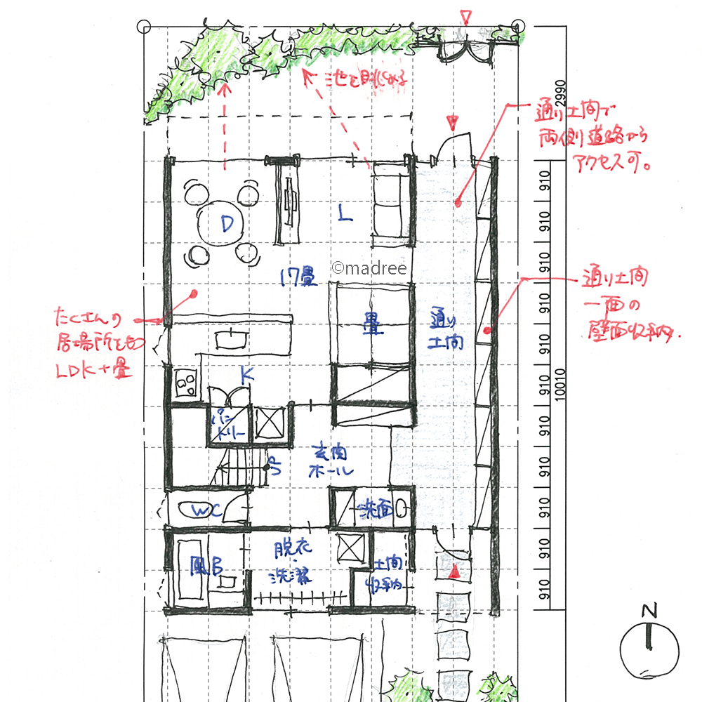 ・通り土間:家の南北方向に通し、玄関ドアを開けた瞬間、調整池の環境が目に飛び込む平面計画としました。南北の道路・庭からアクセス可能で、前面道路と調整池の環境を繋げる役割を持ちます。壁面全体には大容量の収納を設置し、ギャラリーの様に飾り棚としても利用可能です。玄関脇にはアウトドア用品を収納する外部収納も設置しました。