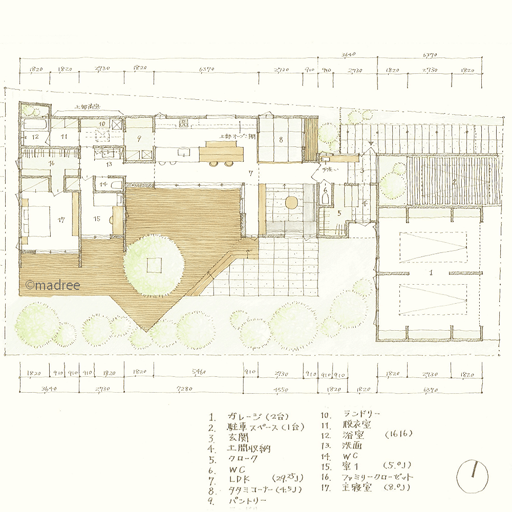 ・ガレージが庭を囲い、道路側から守られた配置となっています。