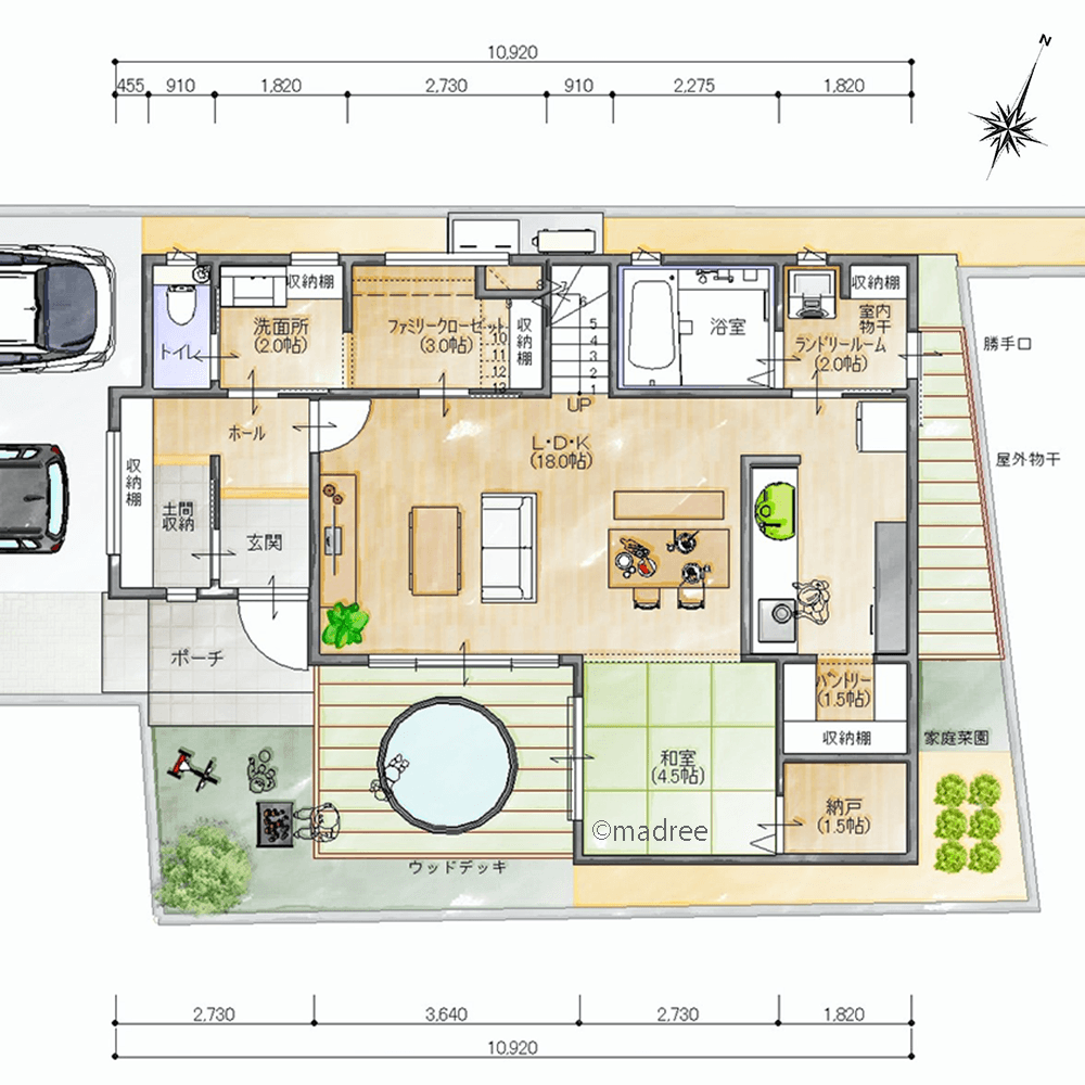 全国の建築家から間取りが集まるmadree(マドリー)で集まった35坪、3LDKの間取りです。外とつながるLDKやアウトドアリビングが特徴の注文住宅の間取りです。