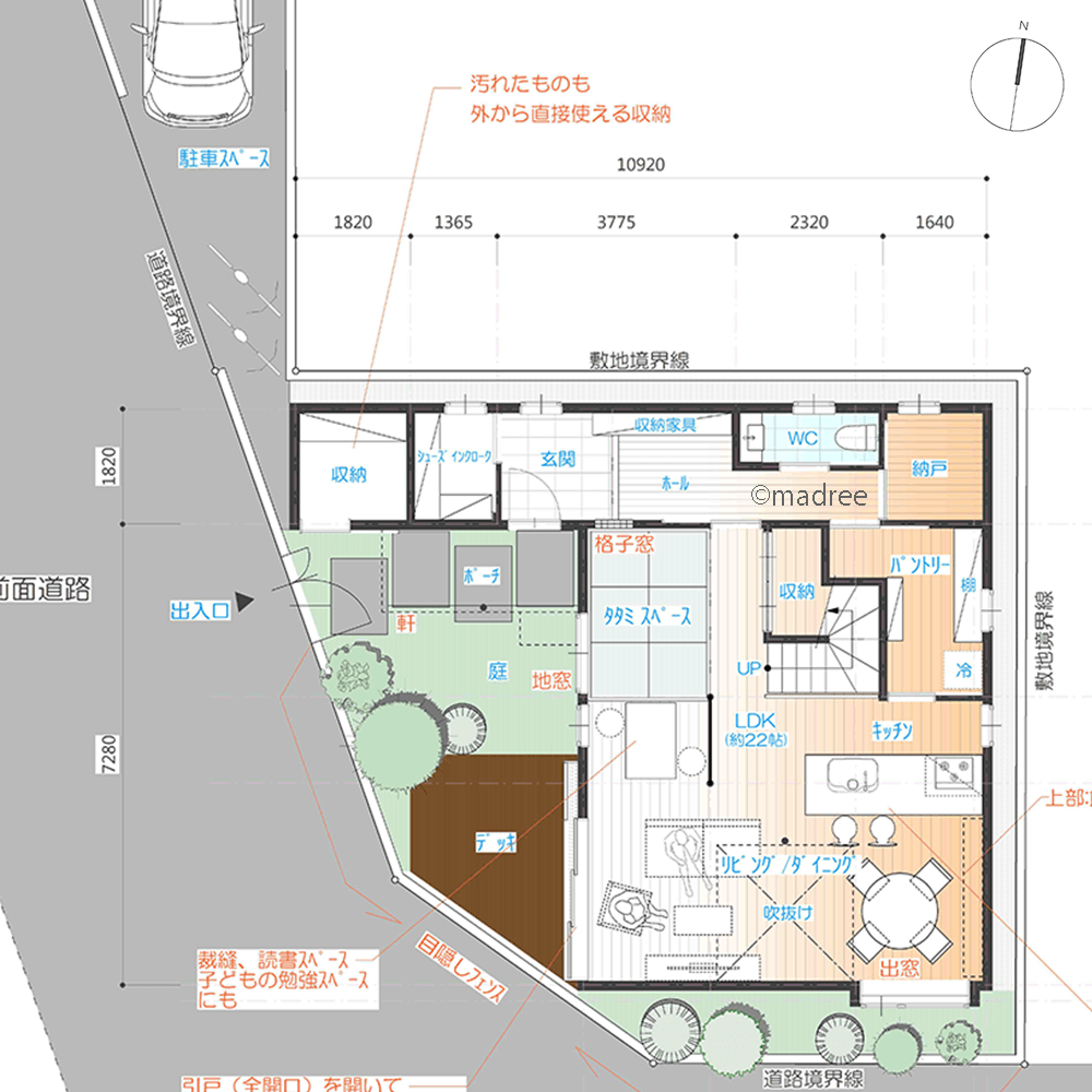 全国の建築家から間取りが集まるmadree(マドリー)で集まった36坪、3LDKの間取りです。外とつながるLDKやアウトドアリビングが特徴の注文住宅の間取りです。