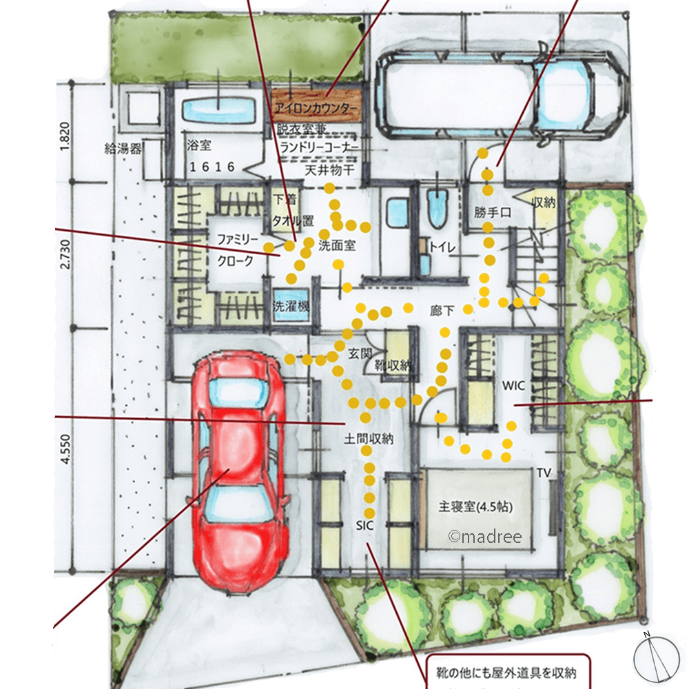 ・洗濯の家事が楽にできるように室内干し、アイロン掛け、収納が短い距離になるようまとめました。朝の身支度も簡潔にできます。