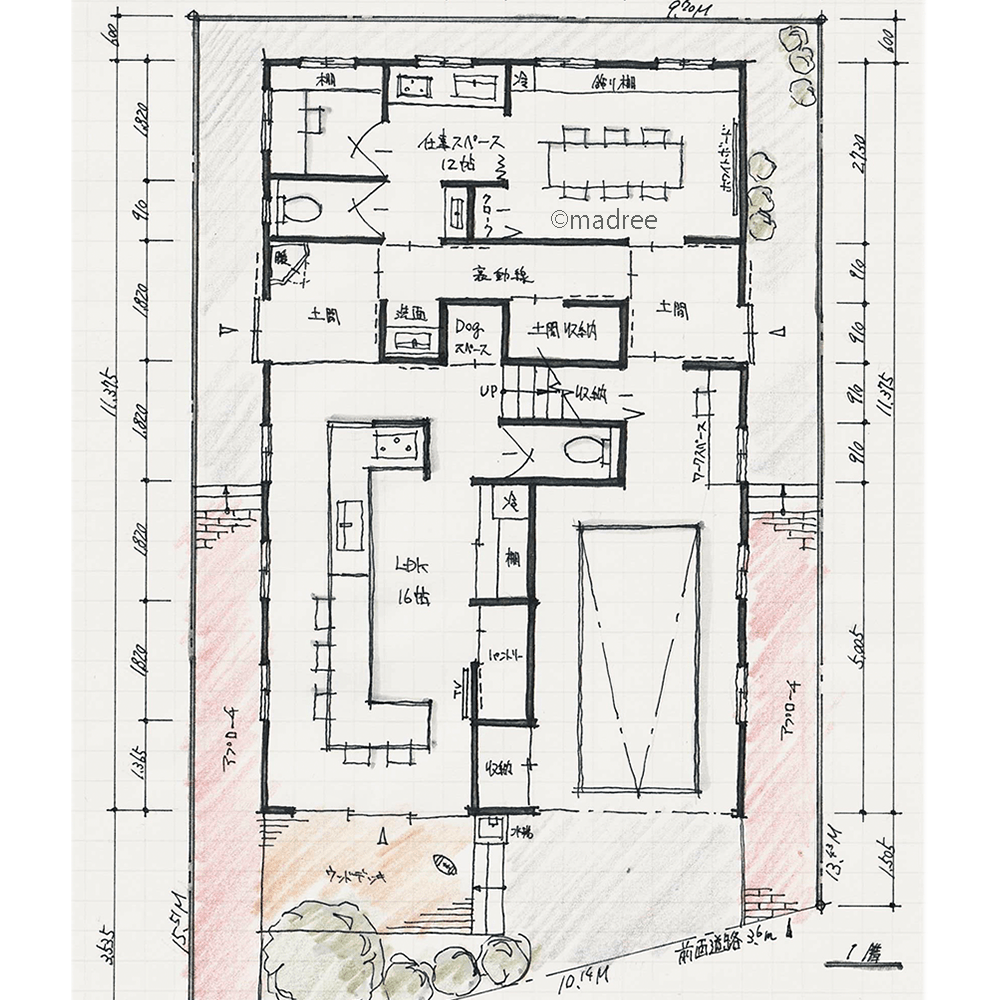 ・駐車スペースはゆったり3メートル幅で、趣味スペースとちょっとした収納も確保。土間空間ともつなぎました。
