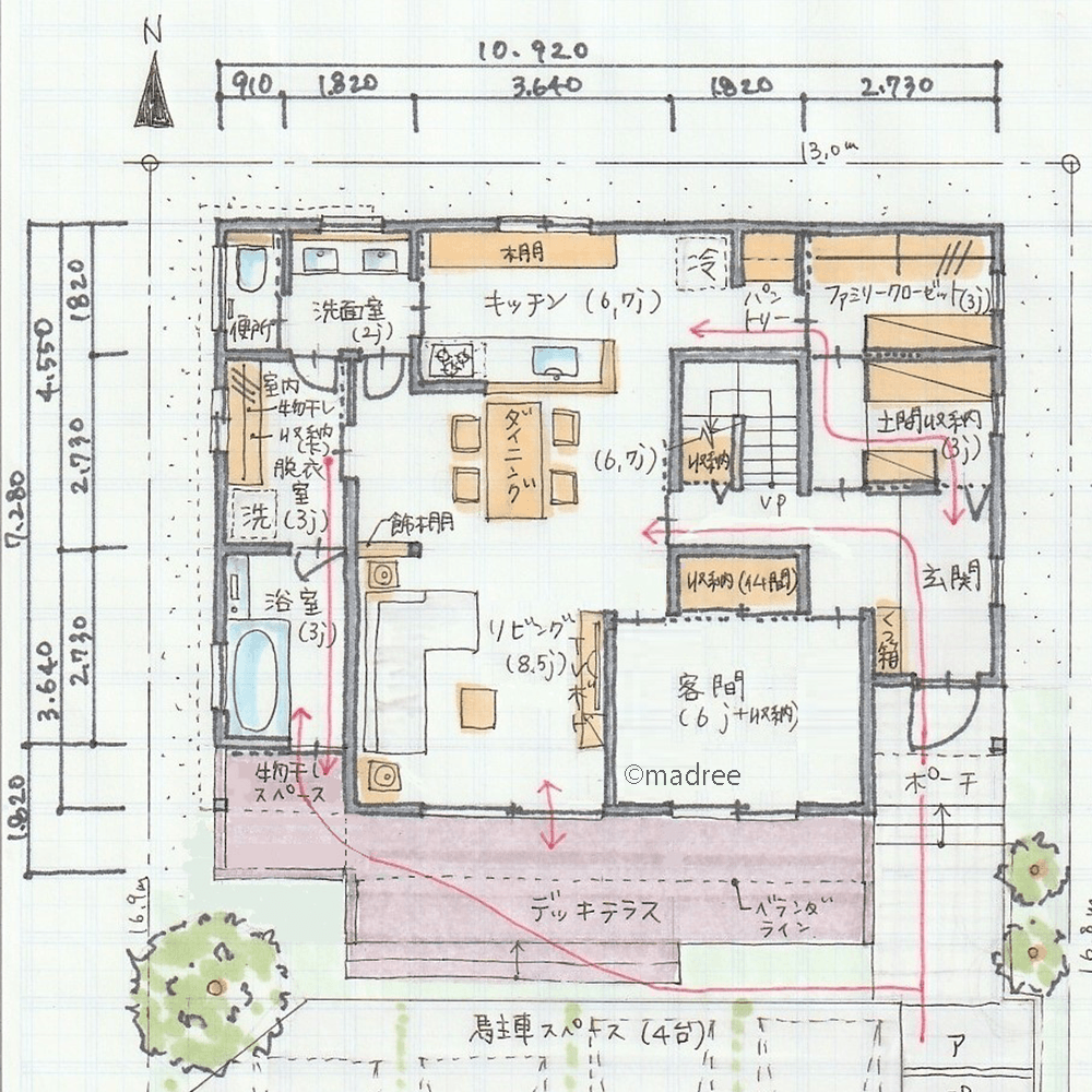 全国の建築家から間取りが集まるmadree(マドリー)で集まった46坪、4LDKの間取りです。外とつながるLDKやアウトドアリビングが特徴の注文住宅の間取りです。