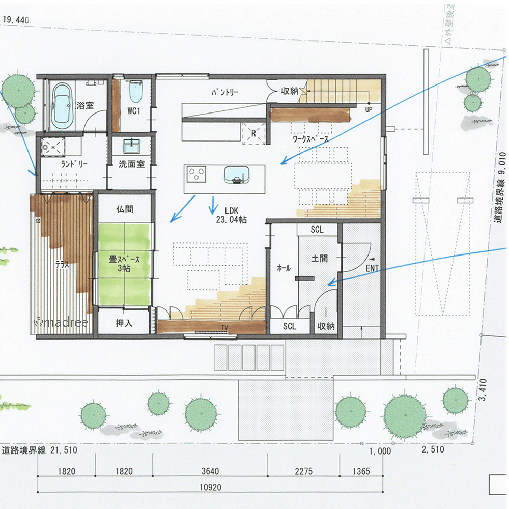 ・アウトドアを楽しむために、車庫と住宅との間に庭を配置し、道路からの視線を遮るようにしました。広めのテラスで子どもとの遊びを楽しむことができます。また、ランドリーが隣接し、洗濯物を干す空間にもなります。