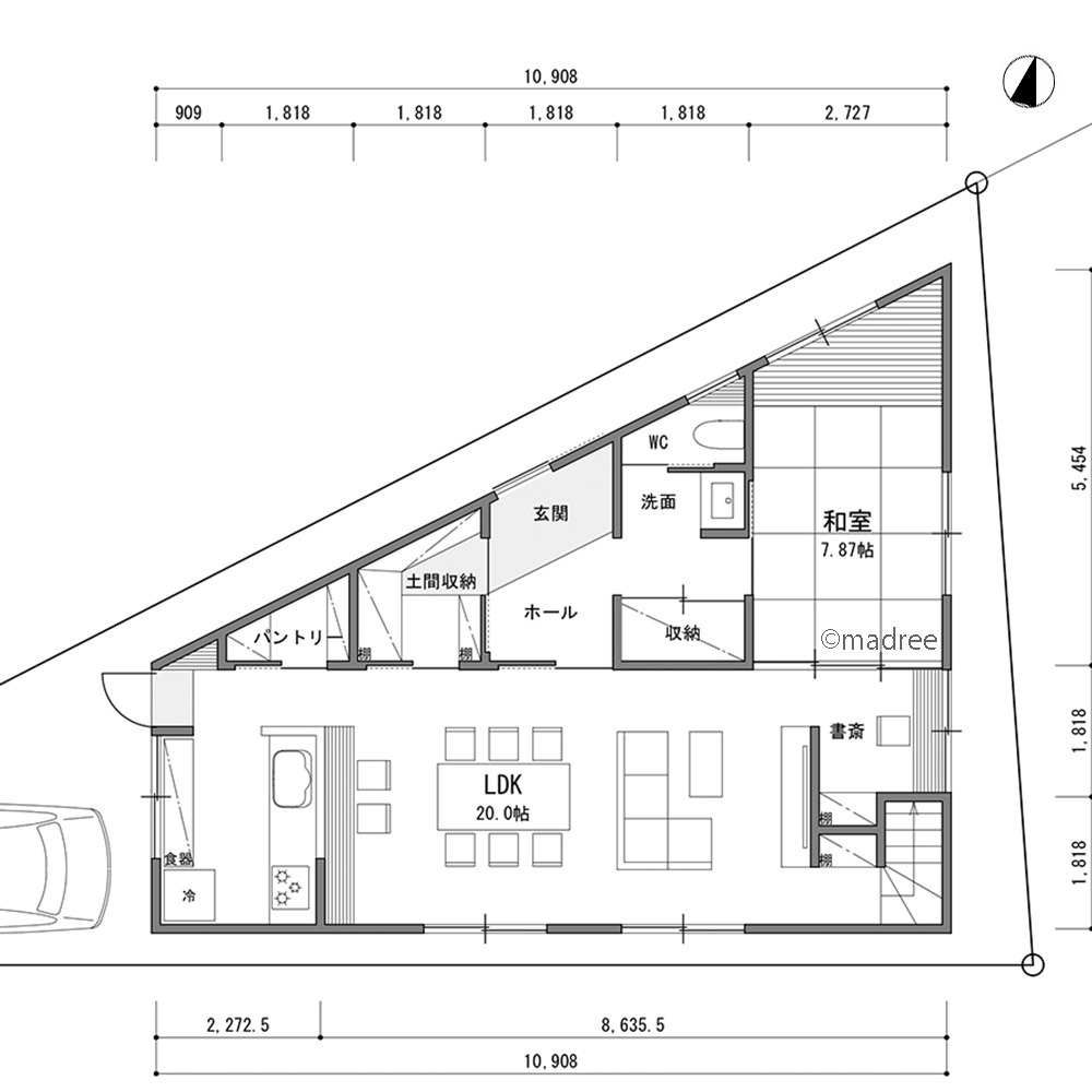 [37坪 4LDK] おもてなし動線で和室へ直行、家族がLDKでゆったり過ごせるの三角地の家の間取り